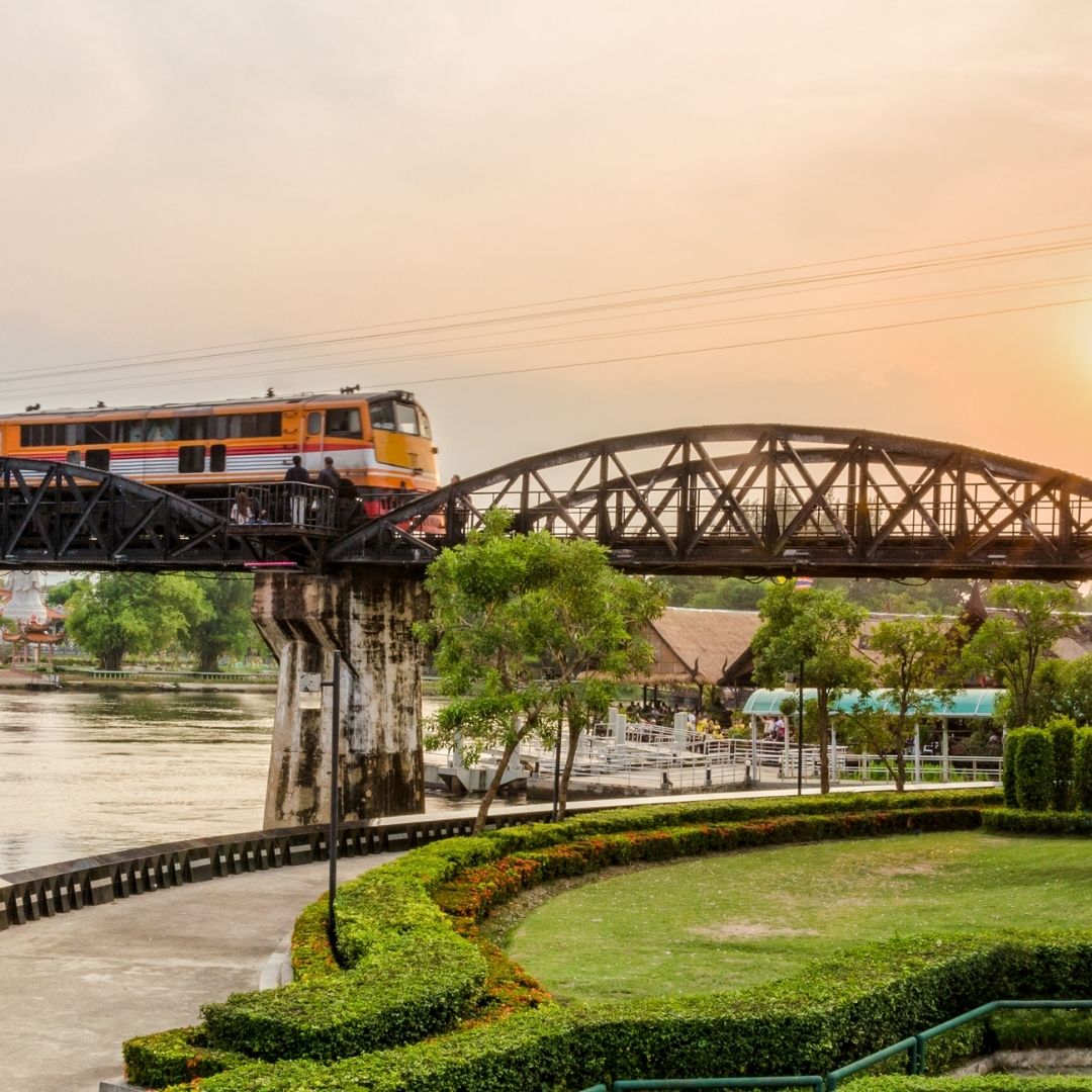 Embarquez à bord d’un train traditionnel avec les habitants, traversez le pont de la rivière Kwaï et admirez les panoramas spectaculaires du viaduc en bois suspendu.