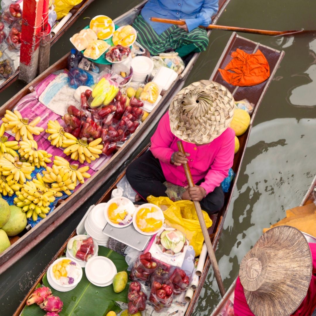Explorez le marché flottant, un véritable labyrinthe de canaux commerciaux où tout s’achète et se vend.